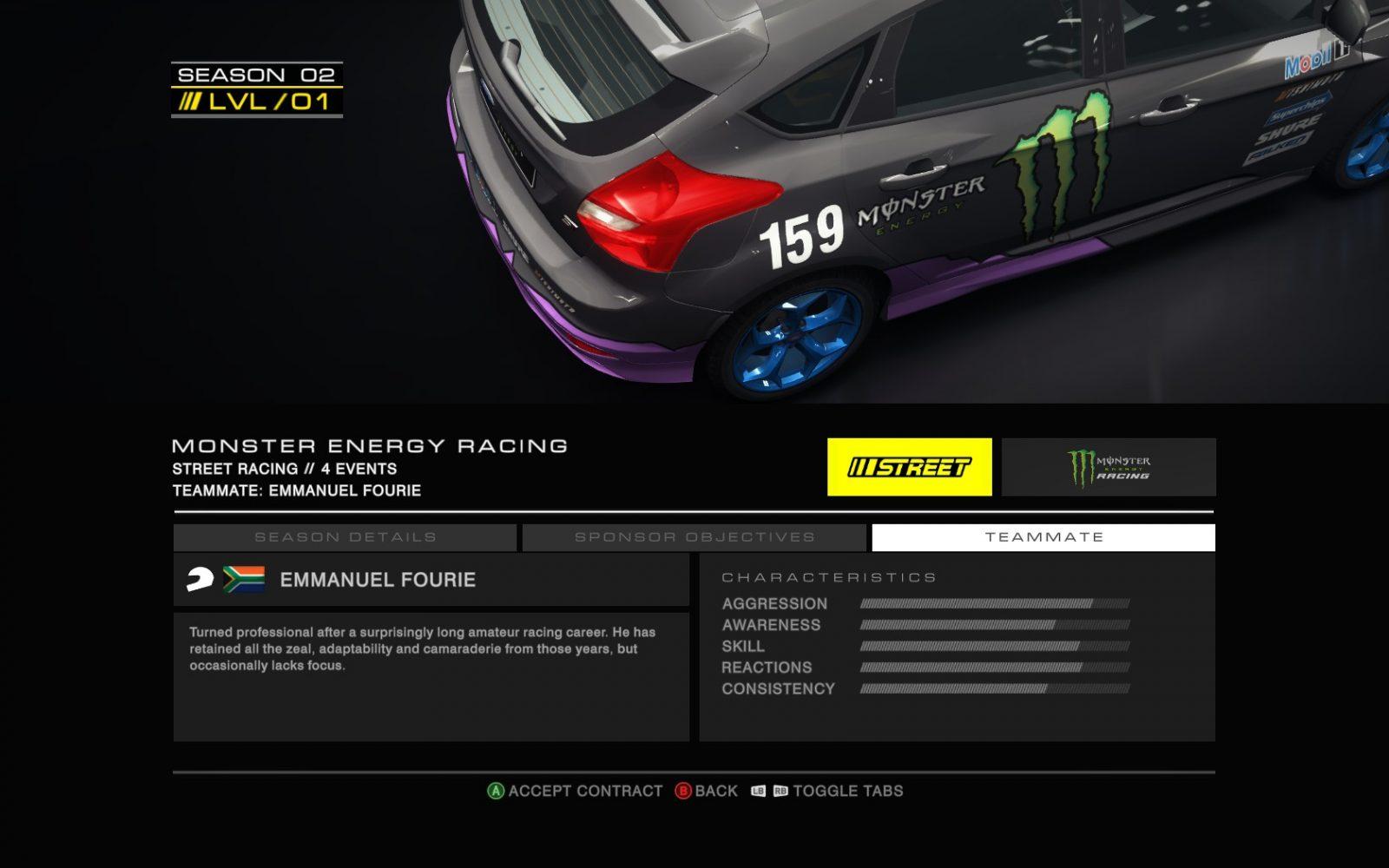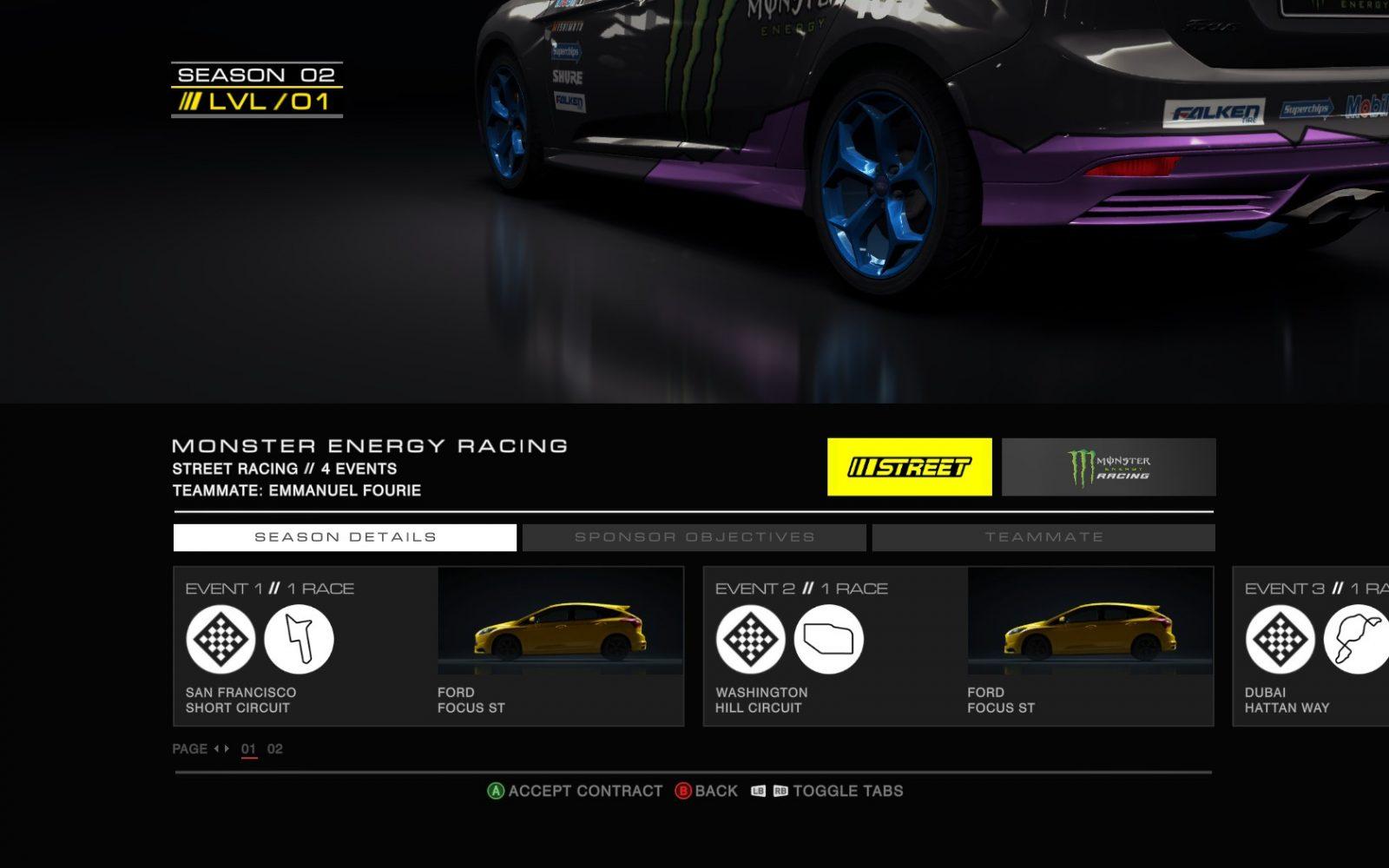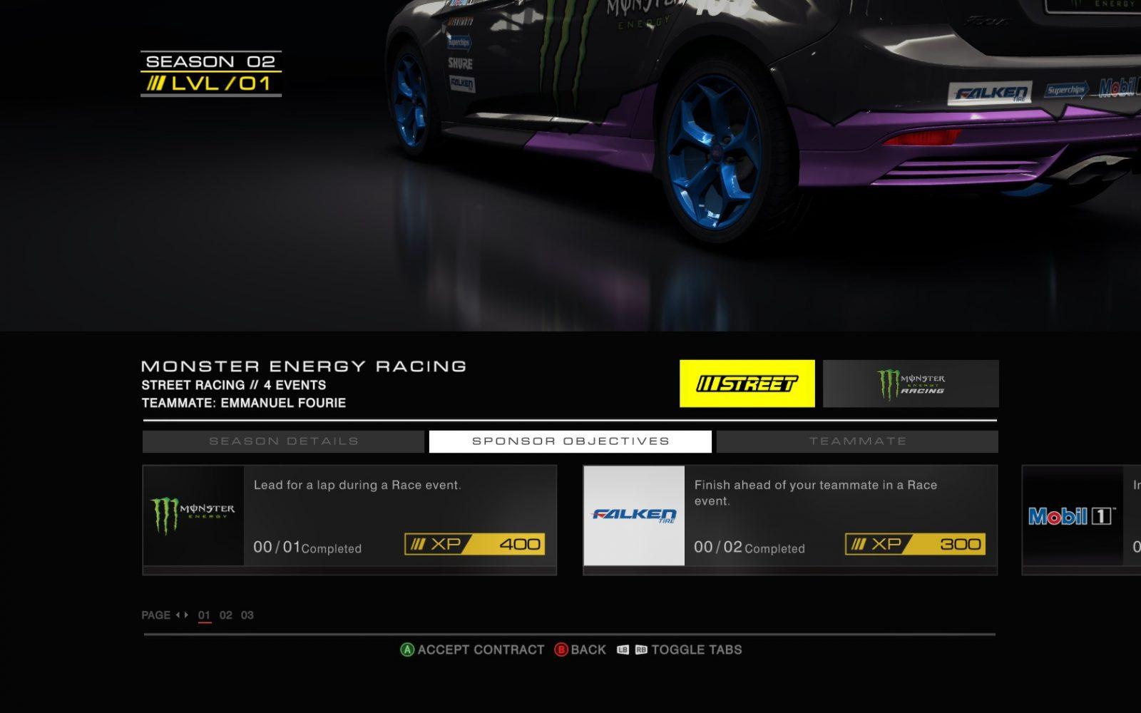 Todas as categorias tem o mesmo objetivo em comum: correr e tentar melhores contratos baseados em seu desempenho durante as corridas. Cada escuderia irá avaliar seu desempenho baseado em objetivos que as mesma colocam em cada corrida. Você deve chegar a frente de um determinado piloto no grid (piloto esse que é seu rival no evento), chegar em uma determinada posição, não bater o carro nenhuma vez e outros desafios nessa linha. Quanto mais desafios você completa, mais experiência você ganha e consequentemente mais acesso a eventos e veículos.