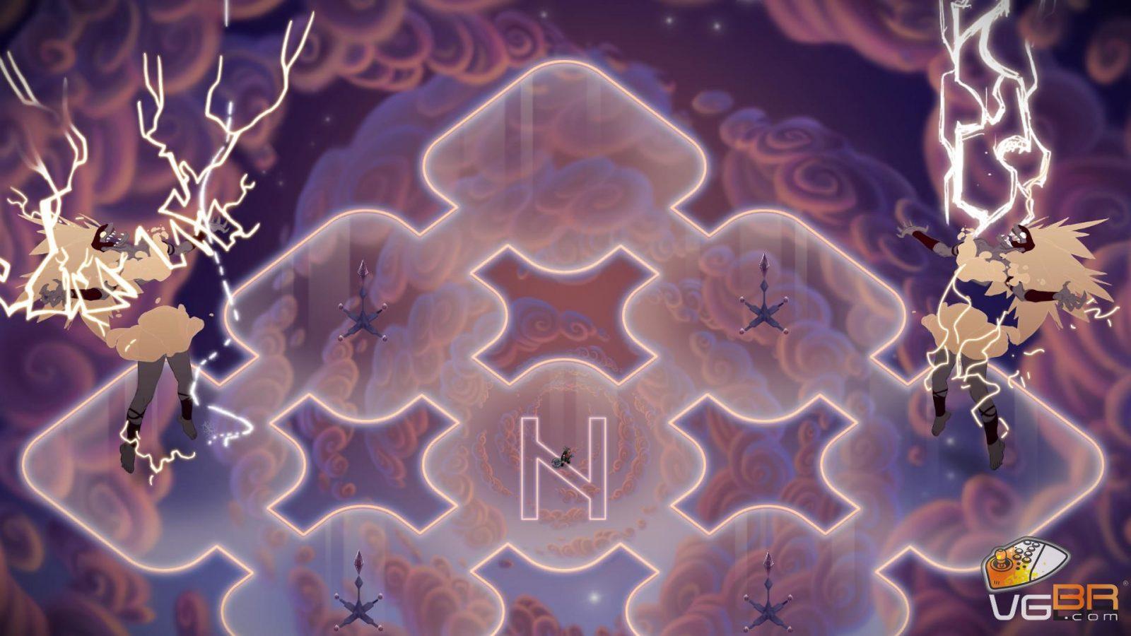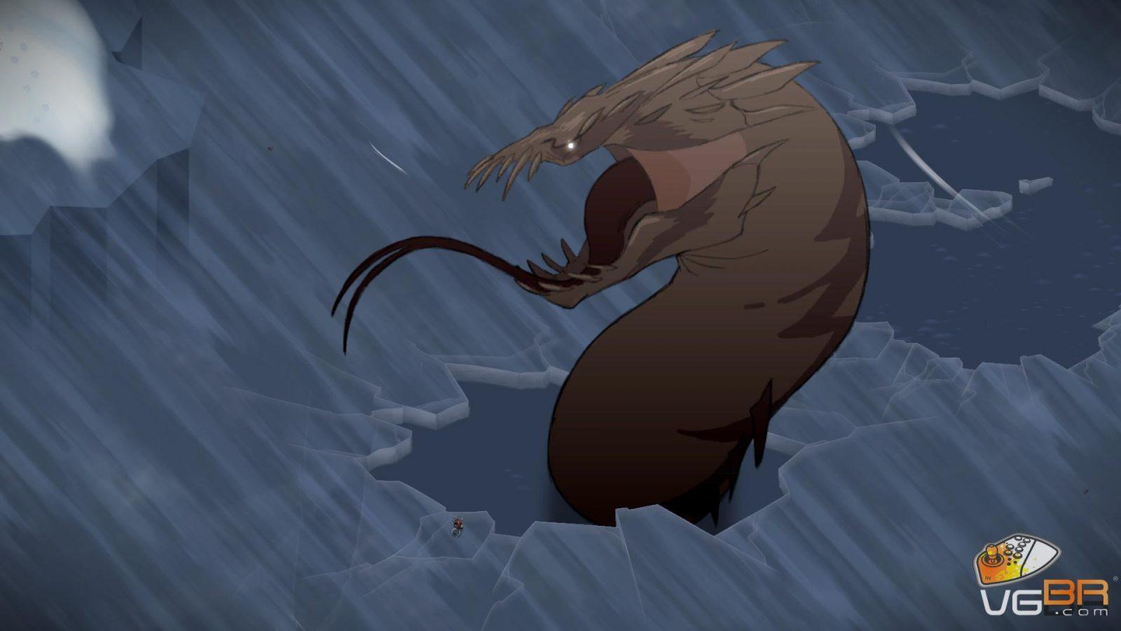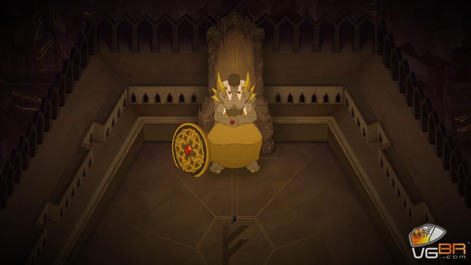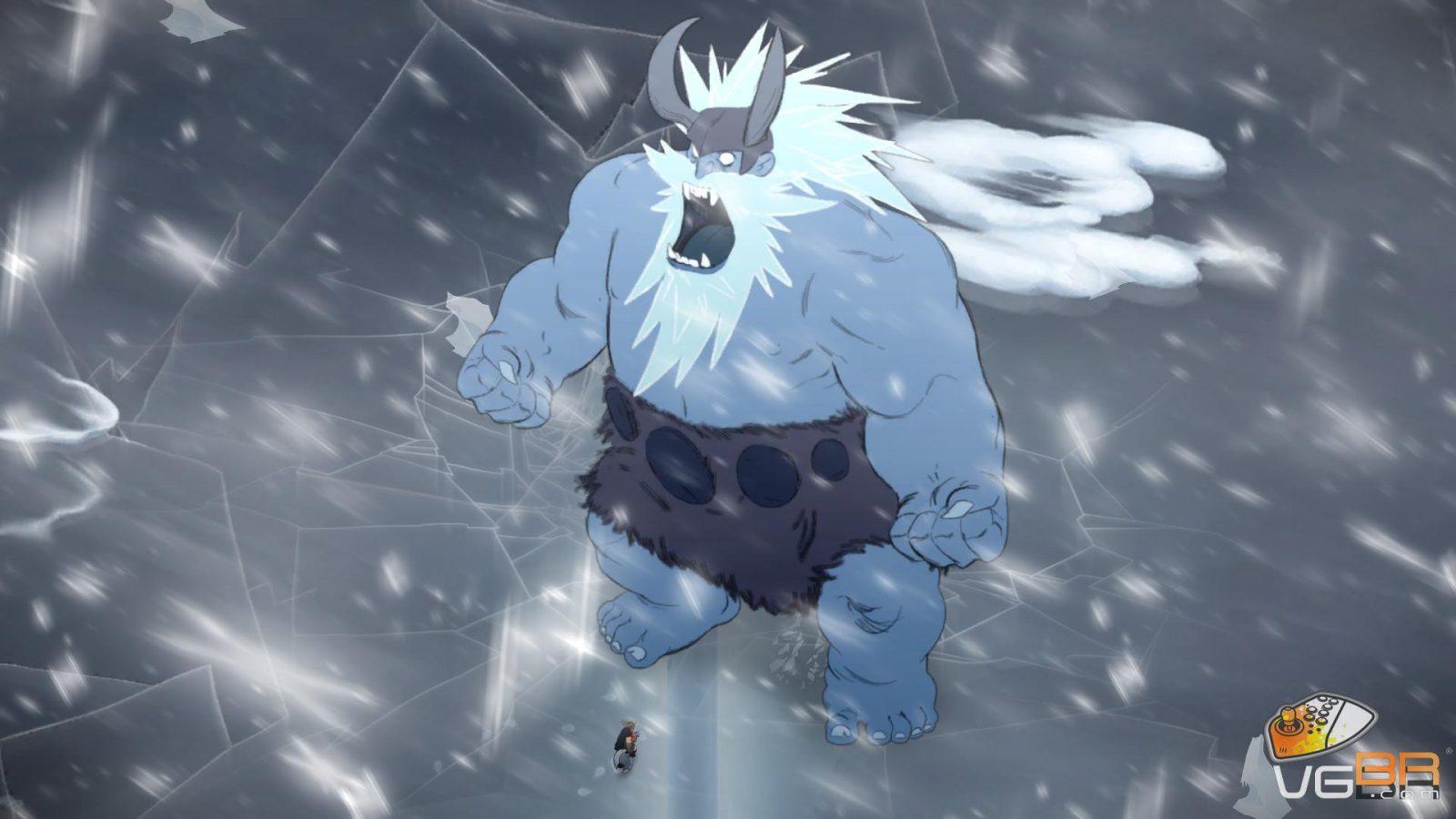 A primeira coisa a se notar em Jotun é o visual desenhado e animado a mão. Existe muito bom gosto em toda arte que tem um design carismático com as animações fluidas, cenários grandiosos e cheios de simbologias da cultura nórdica. A câmera se afasta da personagem em momentos chaves para mostrar a grandiosidade dos cenários e da jornada de Thora.