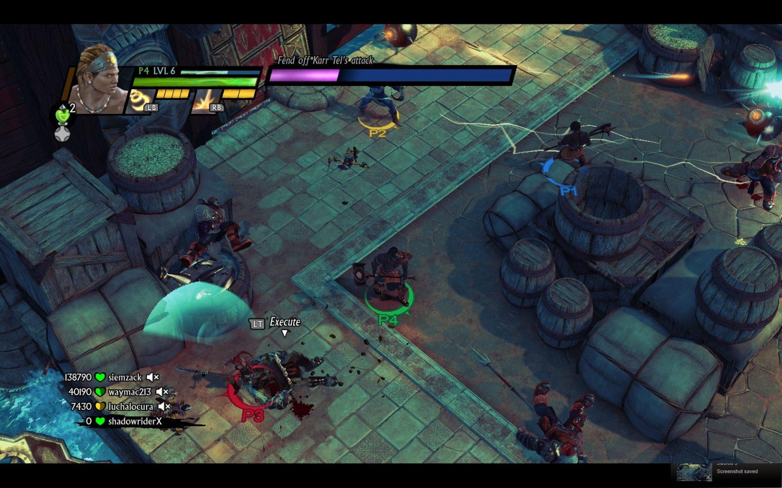 Ah a jogabilidade. Lembram que eu disse que era um jogo de Action RPG nos moldes de grandes jogos do gênero? Beeeemmm, retire o RPG e coloque algo mais como Gauntlet e temos Sacred 3. Primeiro de tudo não temos loot. Você luta atrás de hordas de inimigos, abre baús (que são poucos) e recebe moedas e orbs de energia, mas nada de itens, armas ou armaduras. Tudo isso é ganho durante o jogo e eu sinceramente não consegui descobrir como, já que as vezes você recebe uma arma sem ao menos ter subido de nível. A armadura é sempre a mesma que você começa, mas a medida em que você sobe de nível você pode ir melhorando a mesma o que faz com que ela mude um pouco a aparência.