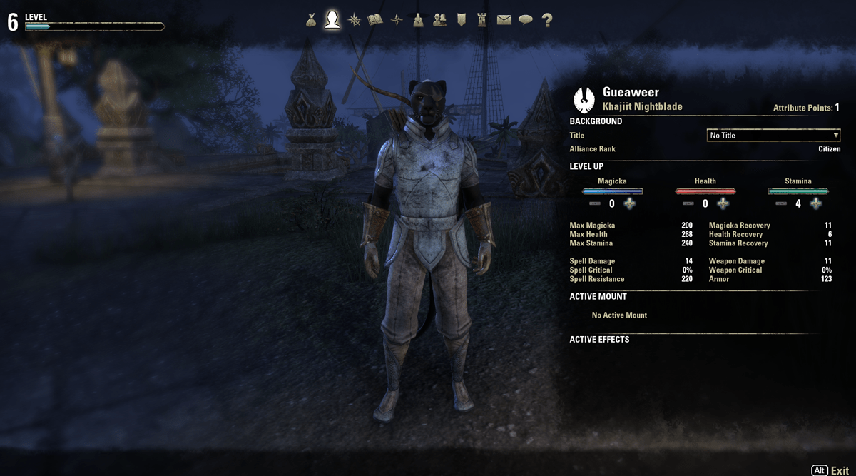 São três atributos: Health, Stamina e Magika. Agora as habilidades, estas sim são muitas. Além de raça, classe, guilda, temos ainda habilidades por armas e armaduras. Estes equipamentos têm seu nível aumentado ao usá-los e com isso é possível ter classes hibridas ou puras. Ao usar arcos por exemplo, as habilidades desse tipo de arma vão sendo destravadas e para que o jogador possa utilizá-las, devera gastar pontos de habilidade nela.