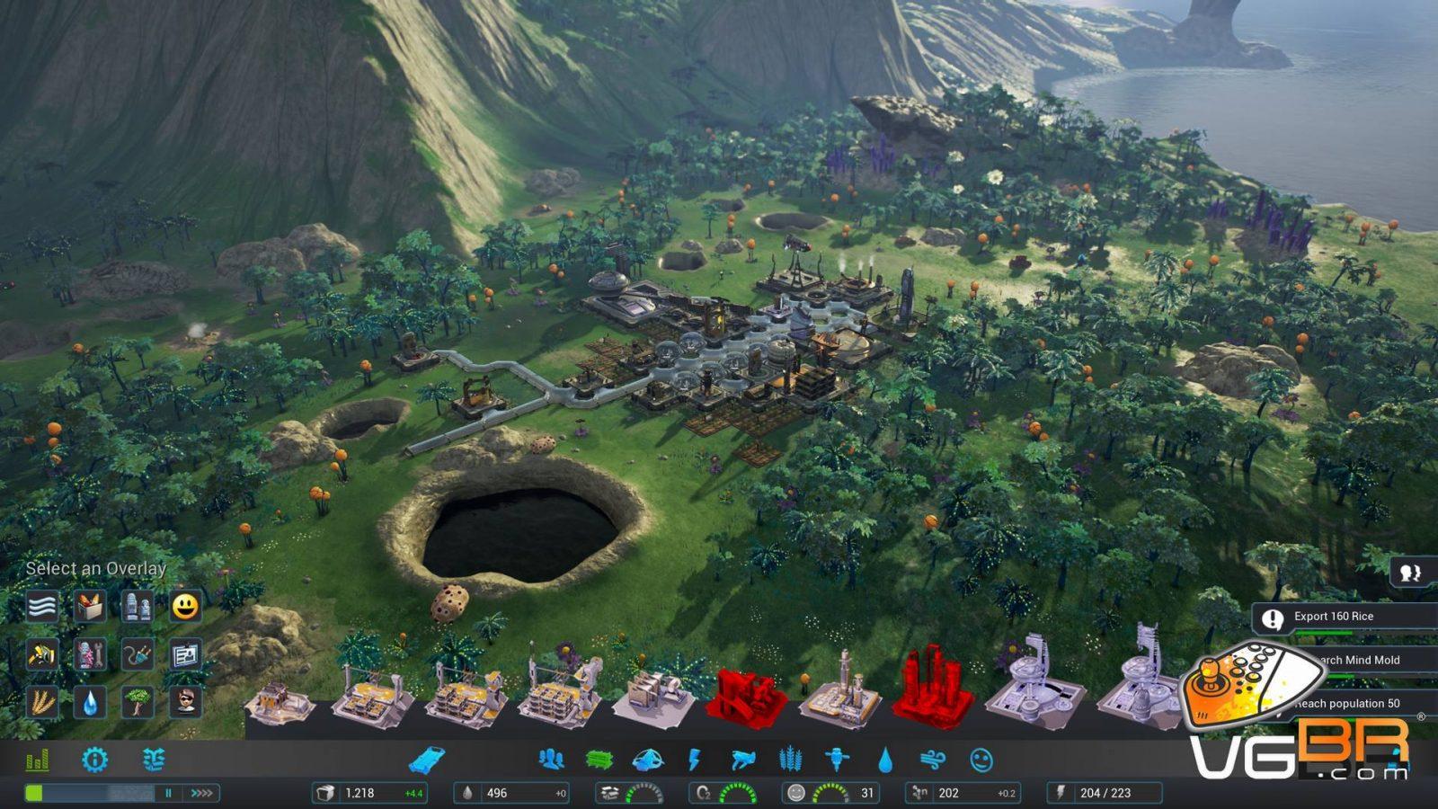 Para ser honesto nunca gostei da visão isométrica nesses games pois acho pouco imersivo e muito difícil de dar peso nos acontecimentos, mas essa câmera é essencial aqui e funciona perfeitamente para o que se propõe. Logo no início somos apresentados a mecânica do game que é muito similar a Sim City mas original a seu modo. Aqui temos que gerenciar coisas que na Terra são básicas e não exploradas nos outros games, como nível de oxigênio da colônia por exemplo. Muitos dos recursos e construções são basicamente evoluções dos outros games desse gênero, então você terá que trabalhar recurso de comida e água, não só quantidade e qualidade mas diversidade também, afinal ninguém é feliz comendo só milho o tempo todo não é mesmo? Energia através dos painéis solares, trabalhadores e etc.