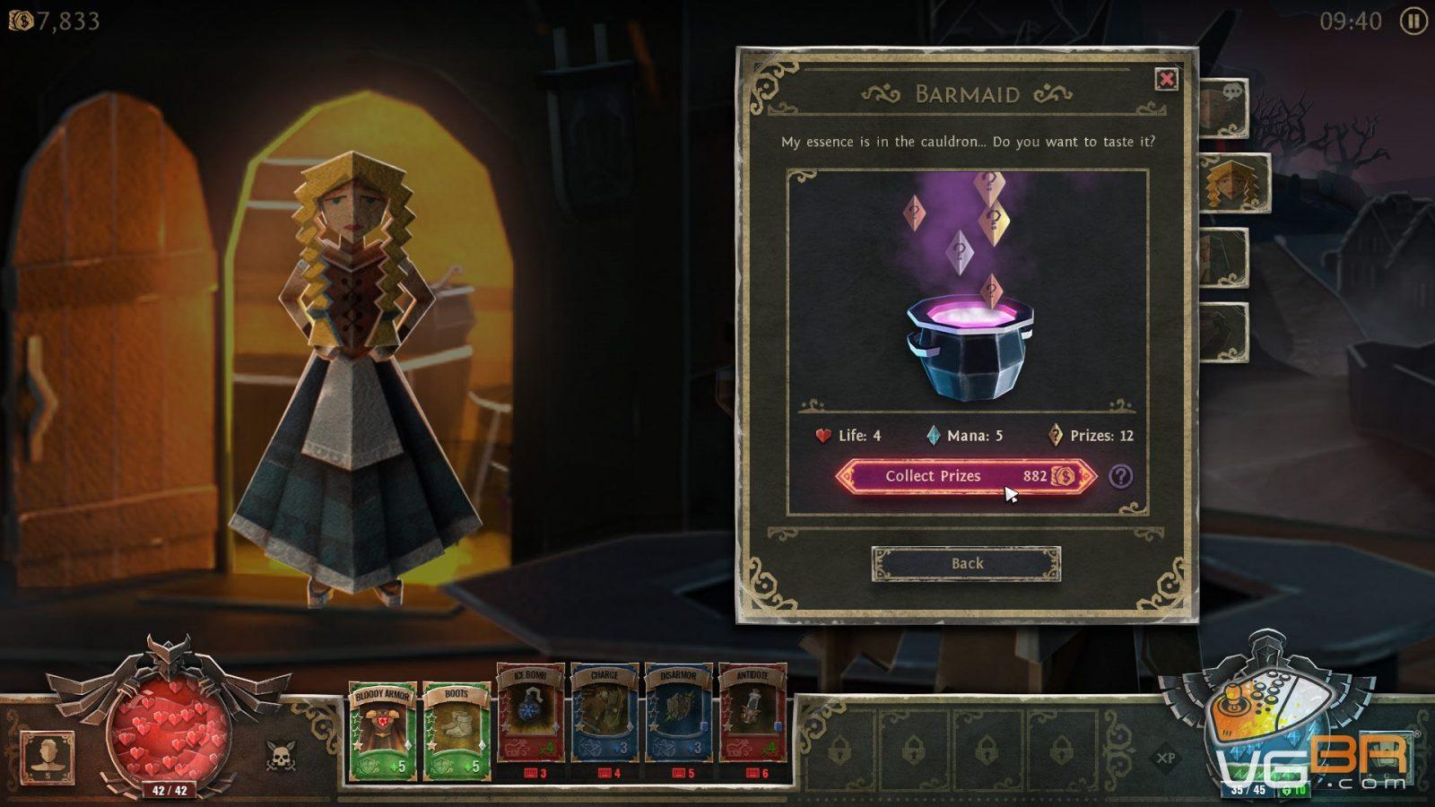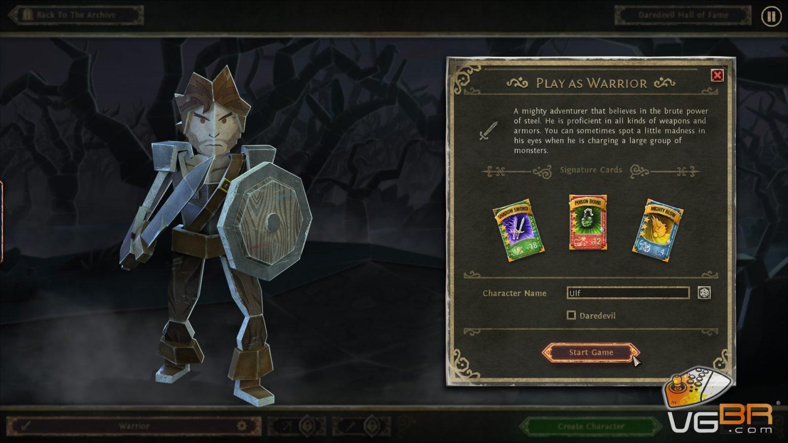 A mecânica do game também é baseada em cartas, como em um card game. As poções, habilidades, magias e atributos especiais são realizados por cartas com uma mecânica semelhante a build normal de um rpg, mas com um “carisma” a mais. Inicialmente o guerreiro consegue segurar três cartas consigo. Eu por exemplo combino sempre um slot de carta de poção, um slot de carta de escudo contra flechas e uma carta com uma habilidade especial que me permite soltar uma rajada de poder no inimigo, arrancando o HP.