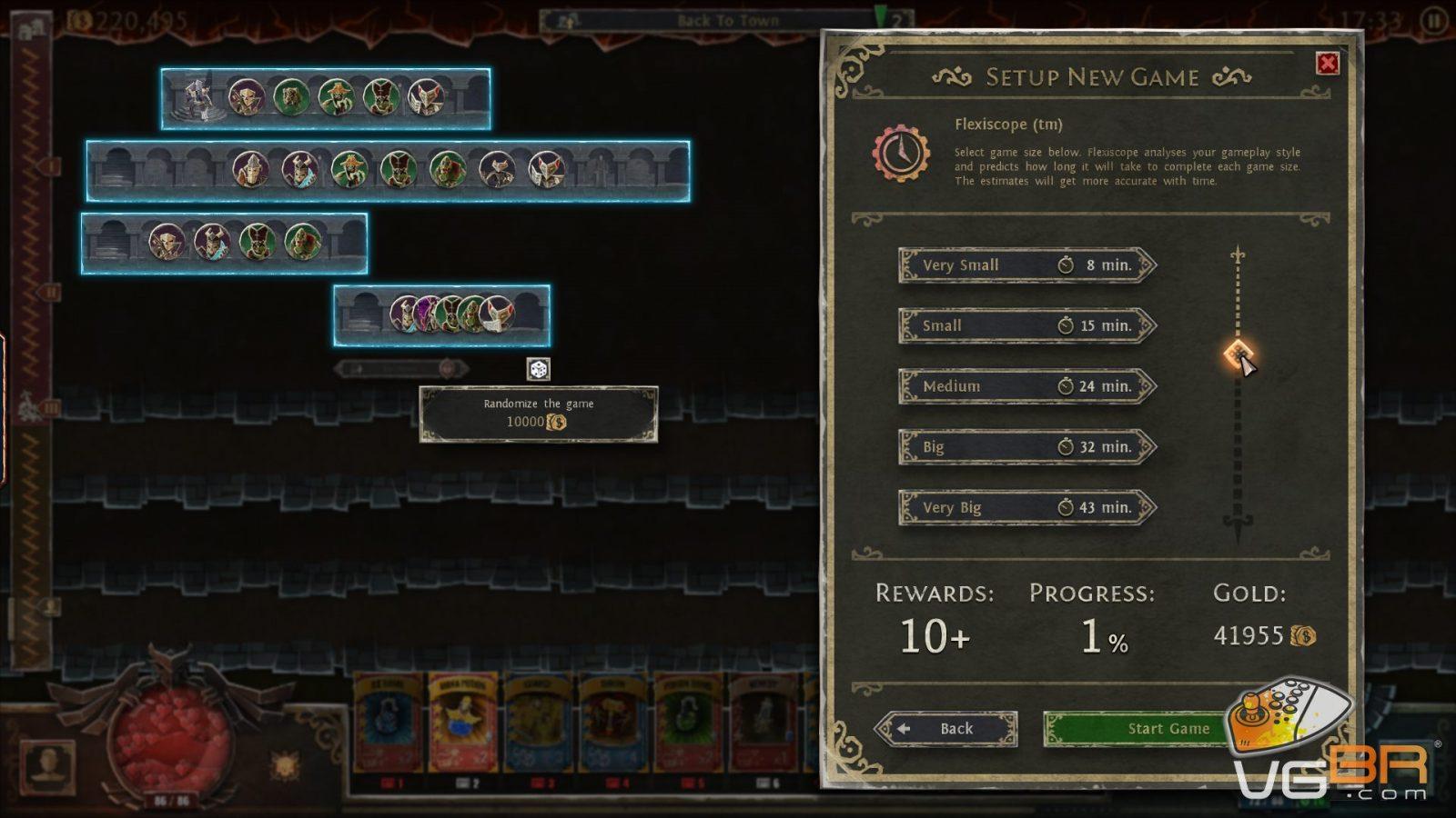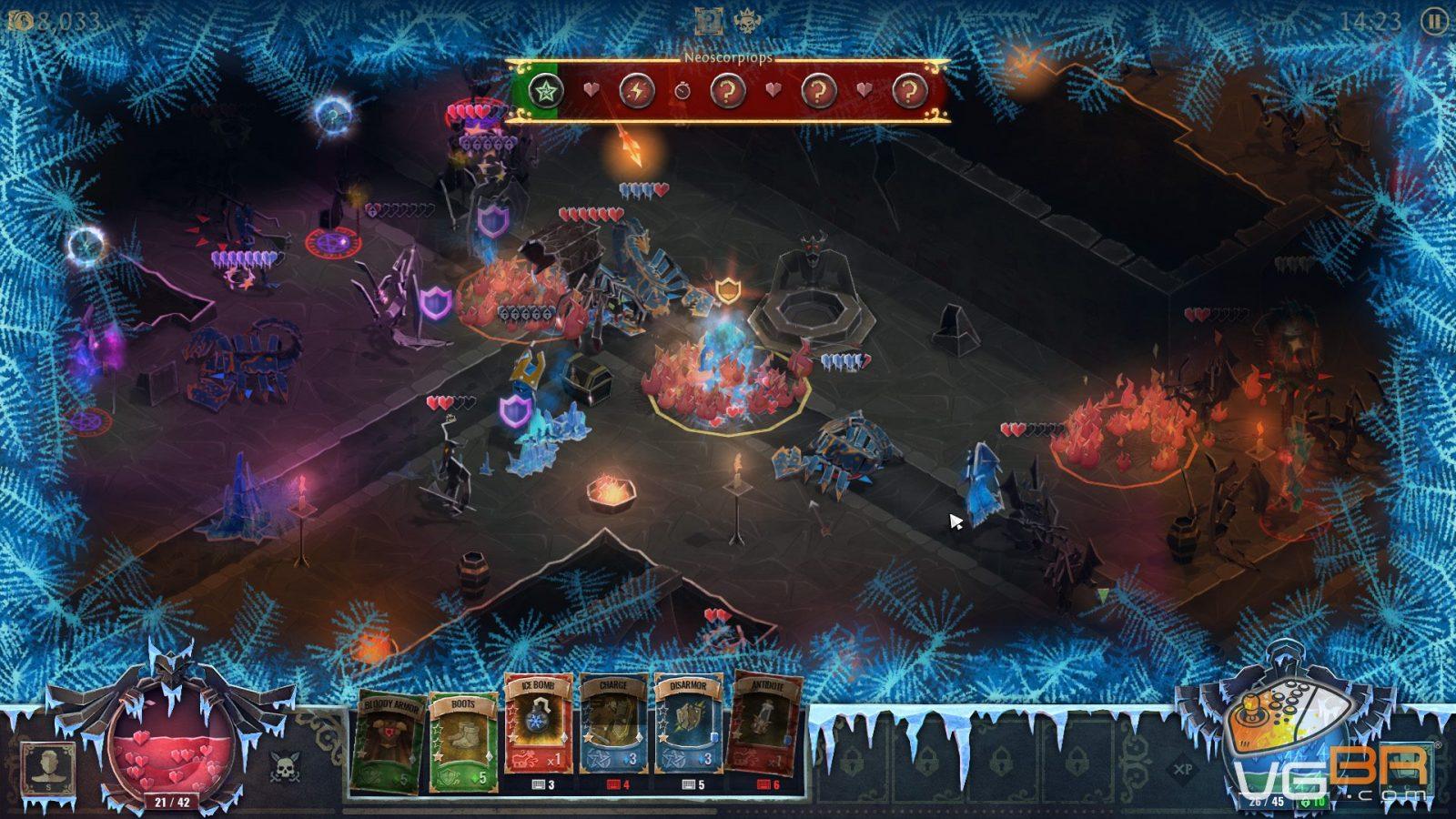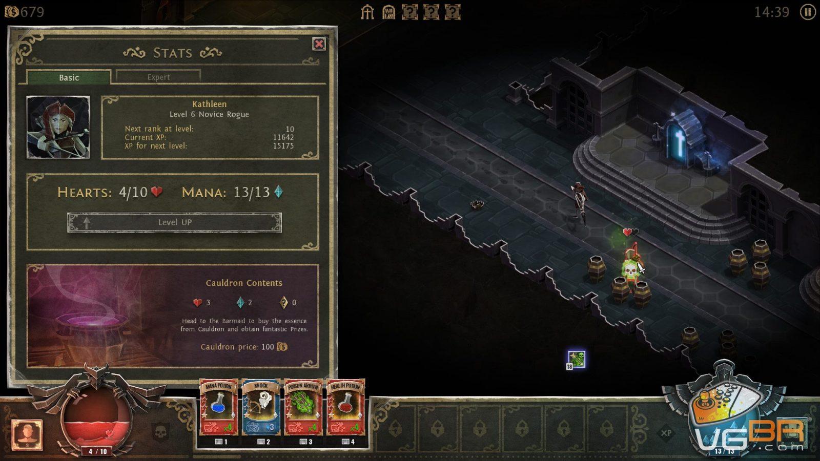 O sistema de nível também é muito interessante e a cada nível que jogador avança todos os inimigos perdem um coração do HP total. A caveira que antes tinha três corações no nível 1, agora possui apenas dois corações e o jogador ainda pode escolher se aumenta seu HP total ou sua mana. Novos níveis são atingidos por matar criaturas e avançar no game e o jogador também pode dar upgrades no personagem e comprar cartas novas através do gold que ele encontra nas masmorras.