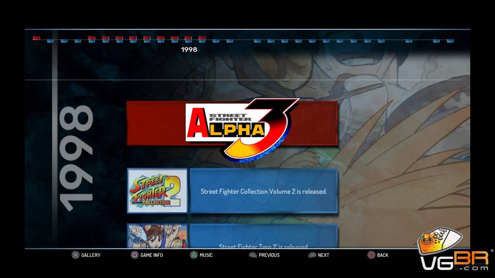 Com Street Fighter 30th Anniversary Collection, os fãs poderão revisitar momentos históricos da franquia, incluindo a estreia de dois dos mais famosos personagens de videogames – Ryu e Ken no primeiro Street Fighter –, e poderão também explorar a linha do tempo dos eventos que ajudaram a criar uma das principais séries de jogos de luta do mundo. Os fãs poderão relembrar a história da série no modo Museu com incríveis artes conceituais, fichas dos personagens e até uma linha do tempo interativa repleta de curiosidades pouco conhecidas. Audiófilos poderão relaxar ao som das mais memoráveis faixas da série no Tocador de Música.
