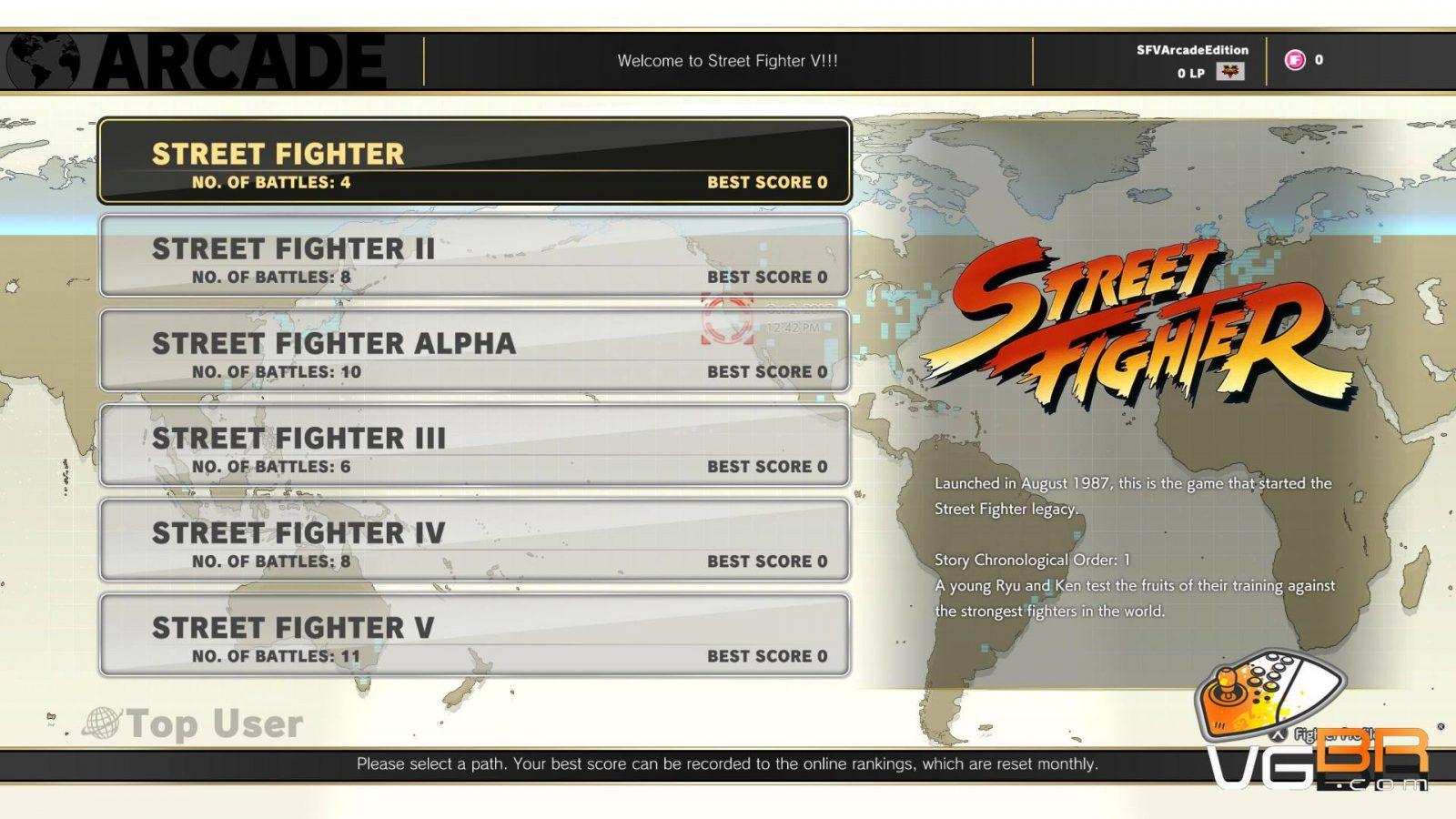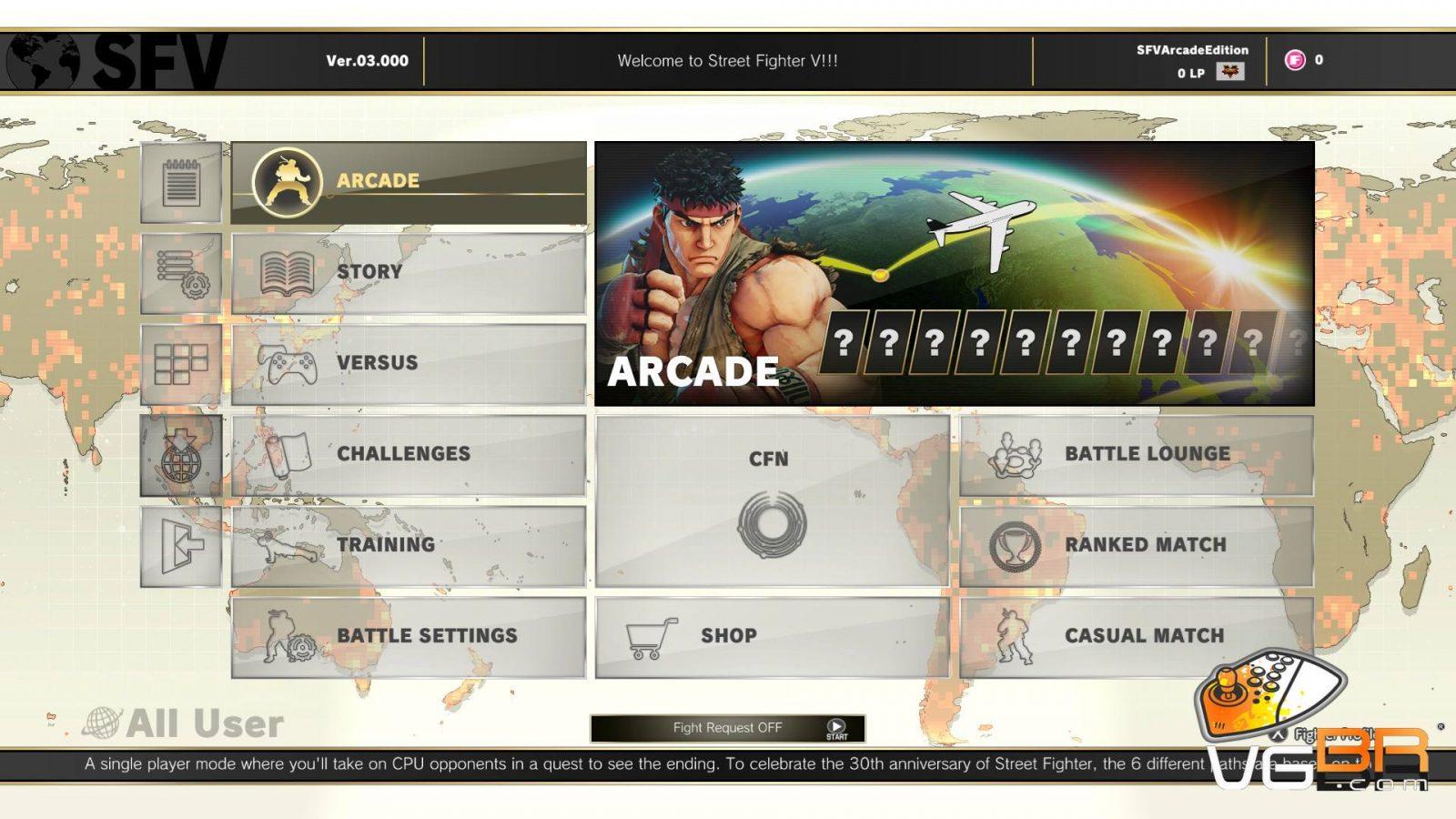 No novo Modo Arcade, os jogadores poderão relembrar a história da série Street Fighter, que está comemorando os seus 30 anos de sucesso. Escolha entre seis diferentes caminhos e lute contra oponentes controlados pela CPU para revelar finais únicos baseados no desempenho do jogador.