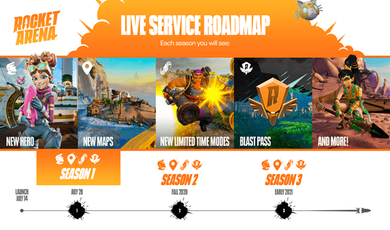 O serviço ao vivo de Rocket Arena está no coração do design do jogo e permitirá que os jogadores se aprofundem na história abrangente, criada pelo escritor/co-criador de TaleSpin, Len Uhley, com a direção do co-criador de Sly Cooper, Dev Madan (agora Diretor Líder de Arte da Final Strike Games). Cada temporada terá duração de aproximadamente três meses e incluirá um novo personagem jogável, eventos por tempo limitado, rotações de modos de jogo, um novo Passe de Impacto, uma nova temporada ranqueada e muito mais! Para obter detalhes completos sobre o que esperar da Temporada 1 e do futuro, visite o post do blog aqui.