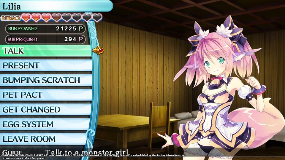 O jogo tem um esquema de recrutamento meio estilo Shin Megami Tensei onde podemos recrutar 50 Monster Girls para nosso time, sendo Lilia a primeira. Quando encontramos uma Monster Girl nos calabouços, inicia uma luta e ela funciona inicialmente como um combate qualquer, com a pequena diferença que vão existir diferentes alvos para serem atingidos e conforme vamos desferindo ataques, esses alvos, que são partes das roupas delas, vão sendo destruídos.