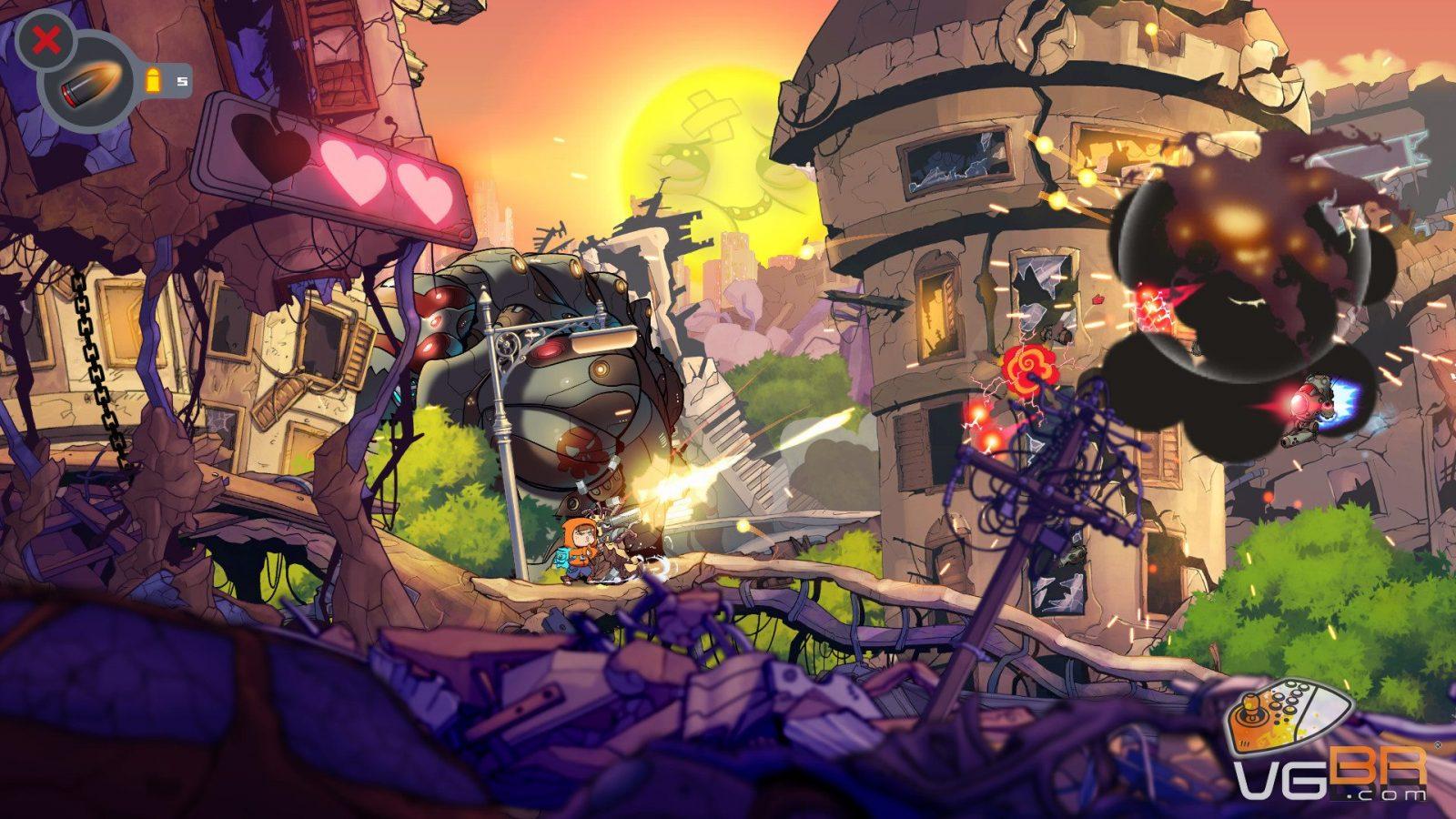 Eu sempre pensei em um game que misturasse a dinâmica das explosões de Metal Slug porém com elementos de puzzle como em FEZ. Essa mistura inusitada é uma ótima forma de descrever Rise and Shine.