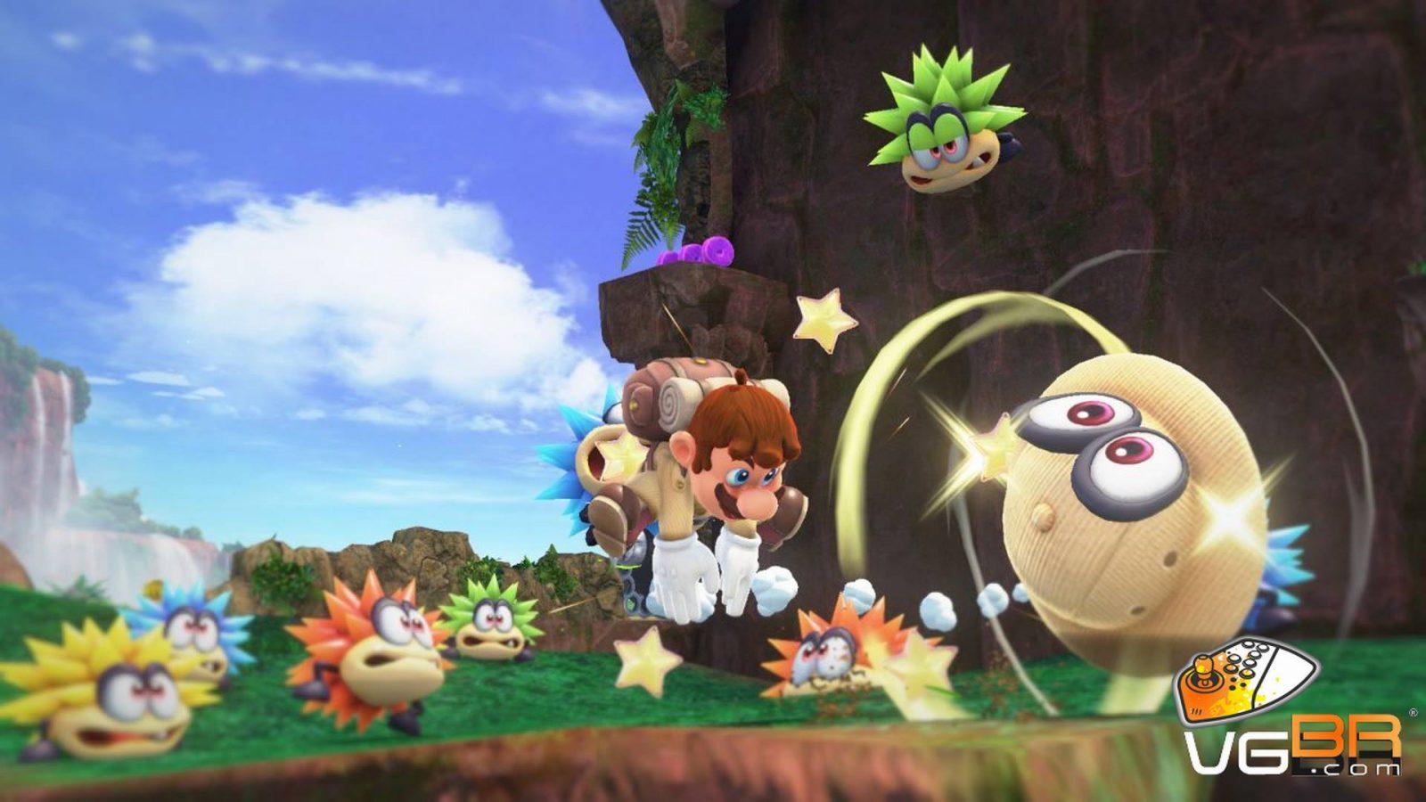 Os controles estão estupidamente precisos e com Cappy na jogada temos uma imensidade de possibilidades dentro do jogo. Seu novo amigo vai roubar os poderes ao melhor estilo Kirby. Além disso ele serve para atacar os inimigos e também como plataforma para você pular mais longe. São diversos movimentos e formas criativas de usar as novas habilidades.